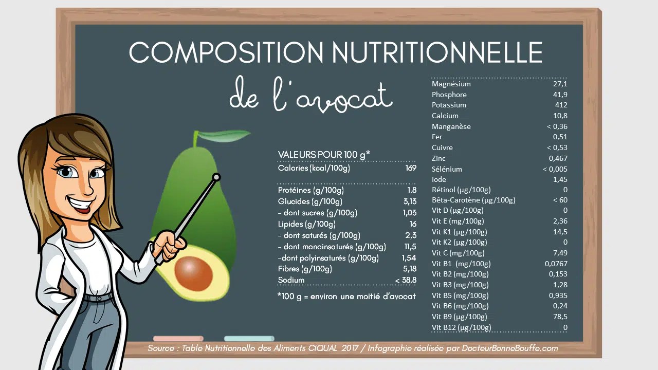 . Il ne contient pas de sel ni de cholestérol et apporte près de 20 vitamines minéraux et dautres combinés végétaux qui peuvent contribuer à améliorer la qualité nutritionnelle de votre alimentation. Calories protides lipides et glucides. Sa pleine saison. Avocat - Composition fiche santé explications et conseils.